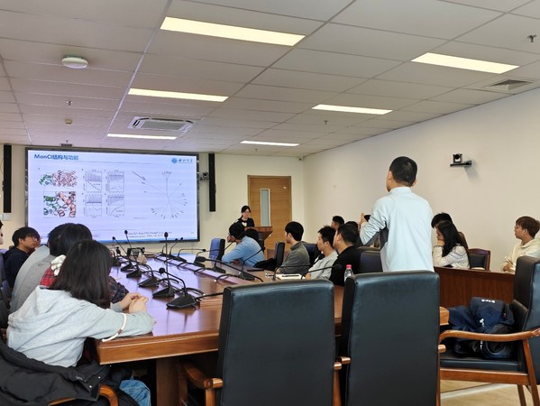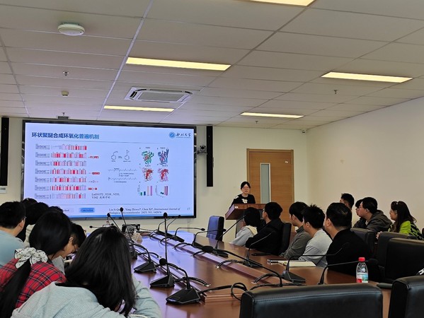 在报告开始,陈希教授先介绍了对天然酶的相关研究,其团队解析了Lsd19的环状聚醚生物合成机制(反Baldwin规则)和Lsd18与MonCI的多环氧化催化及高度空间立体选择性机制,并且总结了酶分子热稳定性和催化效率提高机制。随后,陈希教授介绍了人工酶的设计原理,在蛋白LmrR中插入非天然氨基酸光敏分子,并通过定向进化设计出了新型人工光敏酶Tpe。会后,与会的老师、同学们积极提问发言,与陈希教授就酶的具体研究原理及实验相关细节展开讨论。